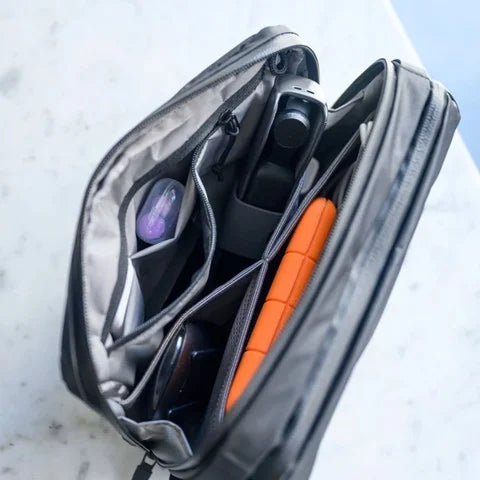 Boundary 設計的 Tech Case 擁有多達 8 個隔層,可讓您舒適地整理您的物品和配件。甚至筆記型電腦配件或刷子等盥洗用品也可以整齊地擺放在那裡。